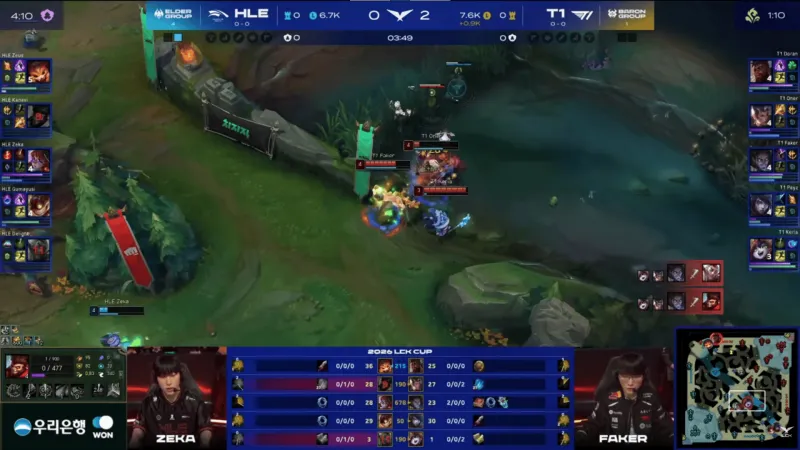 比赛第3分钟,HLE野辅强追残血Oner赵信被反杀,Faker塞拉斯开场3分钟拿到双杀→